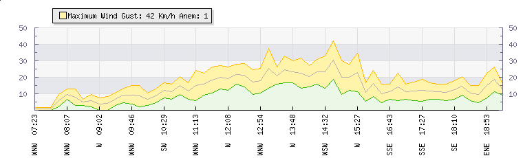 In the last few minutes the wind was South South East at an average speed of 12 kmh, reaching up to 17 kmh and a low of 6 kmh. The gust strength is11 kmh above the minimum speed |