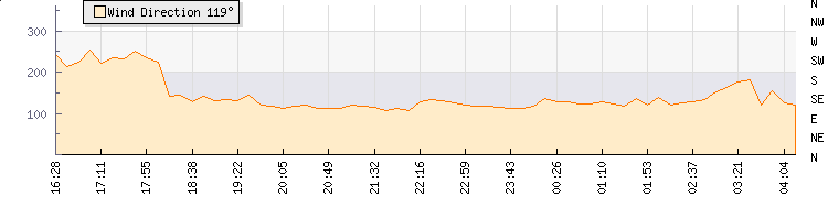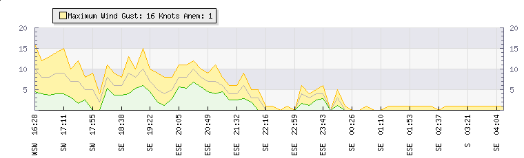 In the last few minutes the wind was East South East at an average speed of 3 knots, reaching up to 4 knots and a low of 1 knots. The gust strength is3 knots above the minimum speed |