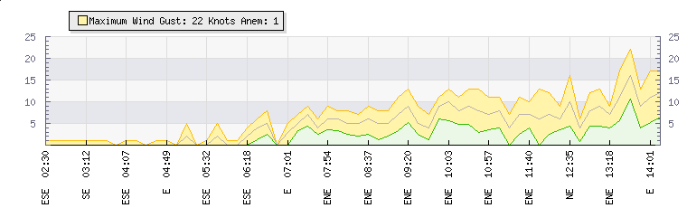 In the last few minutes the wind was Southerly at an average speed of 8 knots, reaching up to 11 knots and a low of 4 knots. The gust strength is7 knots above the minimum speed |