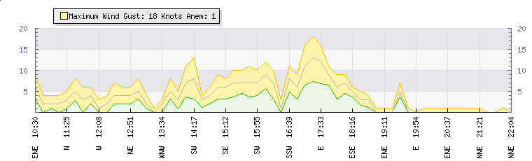 In the last few minutes the wind was North Easterly at an average speed of 1 knots, reaching up to 1 knots and a low of 0 knots. The gust strength is1 knots above the minimum speed |