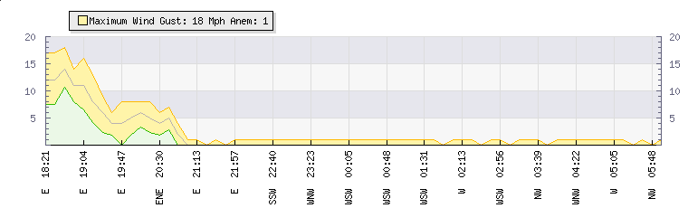 In the last few minutes the wind was West North West at an average speed of 1 mph, reaching up to 1 mph and a low of 0 mph. The gust strength is1 mph above the minimum speed |