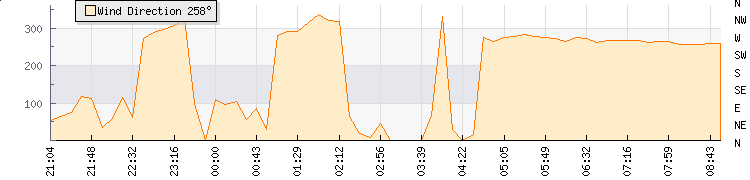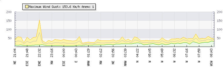 In the last few minutes the wind was Westerly at an average speed of 33 kmh, reaching up to 47 kmh and a low of 20 kmh. The gust strength is27 kmh above the minimum speed |
