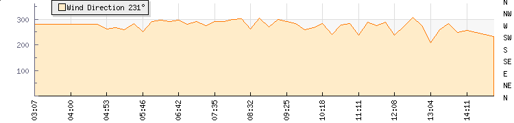 In the last few minutes the wind was West South West at an average speed of 15 kmh, reaching up to 25 kmh and a low of 5 kmh. The gust strength is20 kmh above the minimum speed |
