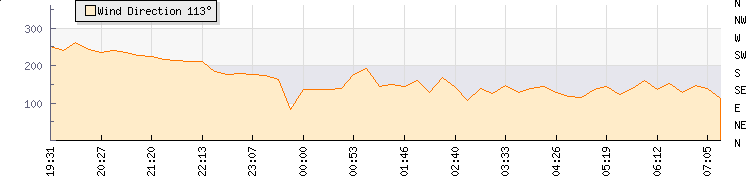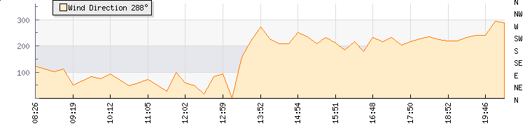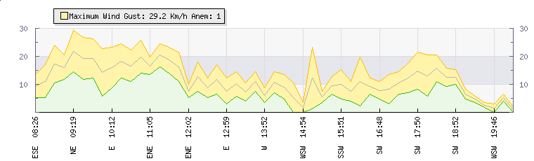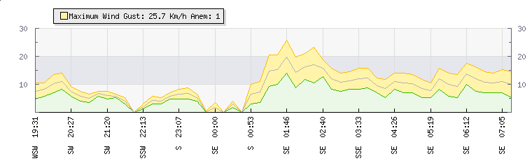 In the last few minutes the wind was South Westerly at an average speed of 13 kmh, reaching up to 16 kmh and a low of 9 kmh. The gust strength is7 kmh above the minimum speed |