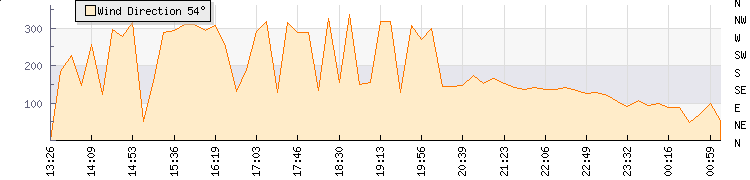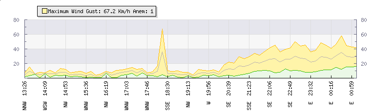In the last few minutes the wind was Easterly at an average speed of 22 kmh, reaching up to 36 kmh and a low of 8 kmh. The gust strength is28 kmh above the minimum speed |