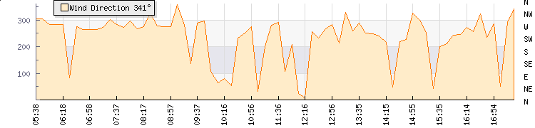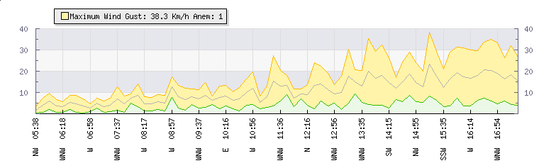 In the last few minutes the wind was West South West at an average speed of 23 kmh, reaching up to 38 kmh and a low of 8 kmh. The gust strength is30 kmh above the minimum speed |