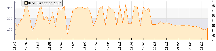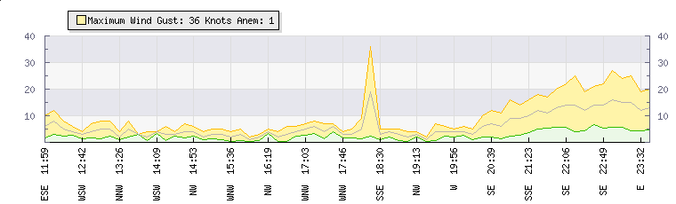 In the last few minutes the wind was South Easterly at an average speed of 14 knots, reaching up to 25 knots and a low of 4 knots. The gust strength is21 knots above the minimum speed |