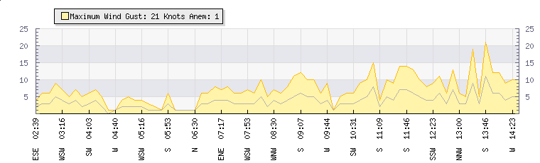 In the last few minutes the wind was North North West at an average speed of 3 knots, reaching up to 6 knots and a low of 0 knots. The gust strength is6 knots above the minimum speed |
