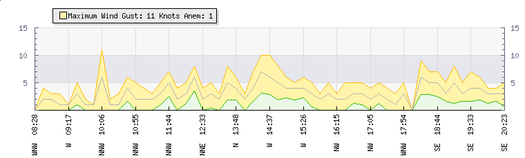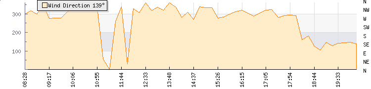 In the last few minutes the wind was South Easterly at an average speed of 5 knots, reaching up to 7 knots and a low of 3 knots. The gust strength is4 knots above the minimum speed |