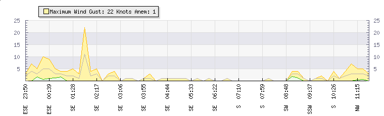 In the last few minutes the wind was South Easterly at an average speed of 1 knots, reaching up to 2 knots and a low of 0 knots. The gust strength is2 knots above the minimum speed |