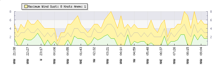 In the last few minutes the wind was North Westerly at an average speed of 5 knots, reaching up to 8 knots and a low of 3 knots. The gust strength is5 knots above the minimum speed |