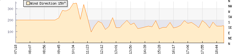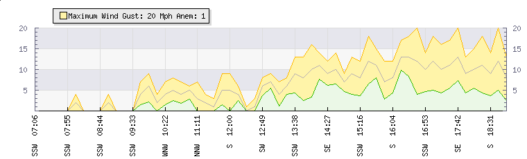 In the last few minutes the wind was South South East at an average speed of 11 mph, reaching up to 17 mph and a low of 5 mph. The gust strength is12 mph above the minimum speed |