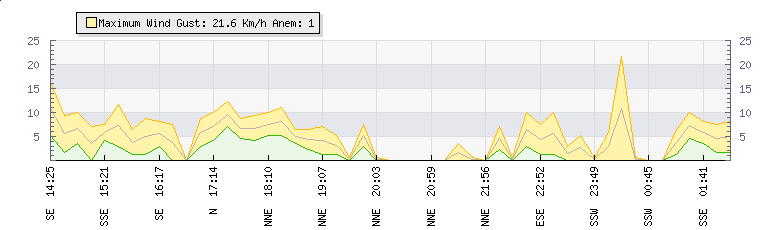 In the last few minutes the wind was South South West at an average speed of 0 kmh, reaching up to 0 kmh and a low of 0 kmh. The gust strength is0 kmh above the minimum speed |