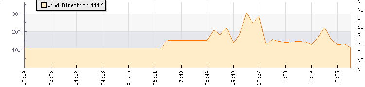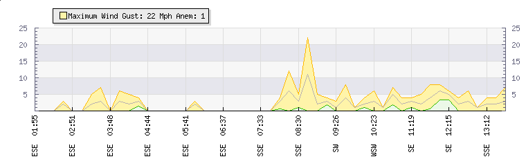 In the last few minutes the wind was South South East at an average speed of 6 mph, reaching up to 8 mph and a low of 3 mph. The gust strength is5 mph above the minimum speed |