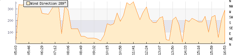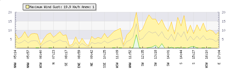 In the last few minutes the wind was Southerly at an average speed of 4 kmh, reaching up to 8 kmh and a low of 1 kmh. The gust strength is7 kmh above the minimum speed |