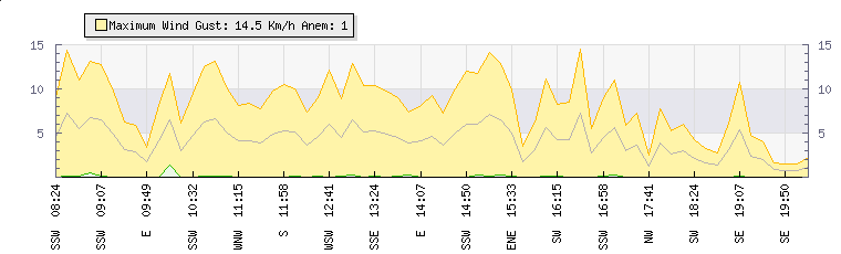 In the last few minutes the wind was North North East at an average speed of 2 kmh, reaching up to 4 kmh and a low of 0 kmh.  The gust strength is4 kmh above the minimum speed             |
