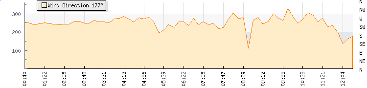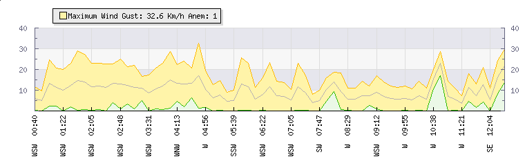In the last few minutes the wind was West South West at an average speed of 9 kmh, reaching up to 17 kmh and a low of 0 kmh. The gust strength is17 kmh above the minimum speed |