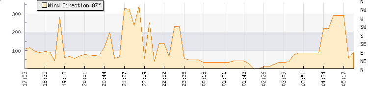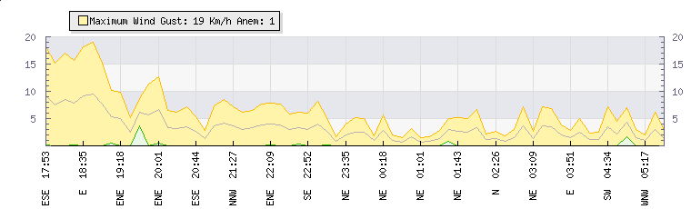 In the last few minutes the wind was North Easterly at an average speed of 4 kmh, reaching up to 7 kmh and a low of 0 kmh. The gust strength is7 kmh above the minimum speed |