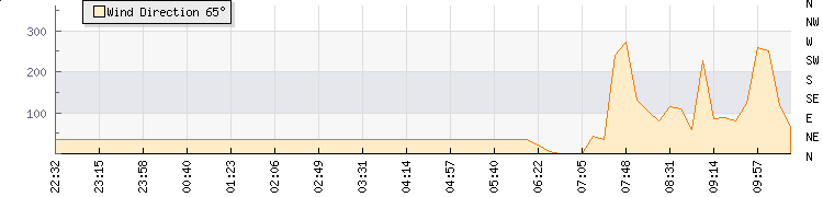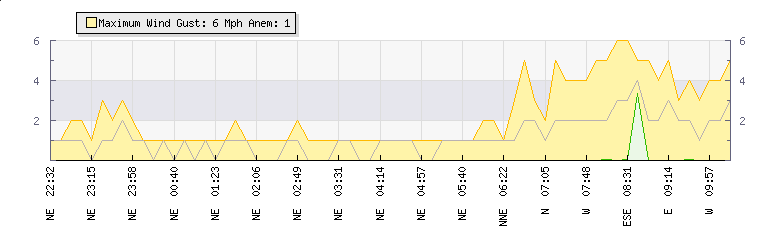In the last few minutes the wind was East South East at an average speed of 3 mph, reaching up to 6 mph and a low of 0 mph. The gust strength is6 mph above the minimum speed |