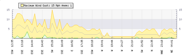 In the last few minutes the wind was Westerly at an average speed of 1 mph, reaching up to 1 mph and a low of 0 mph. The gust strength is1 mph above the minimum speed |