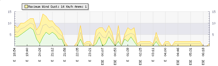 In the last few minutes the wind was Easterly at an average speed of 0 kmh, reaching up to 0 kmh and a low of 0 kmh. The gust strength is0 kmh above the minimum speed |