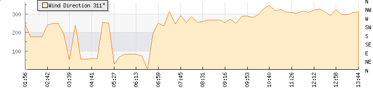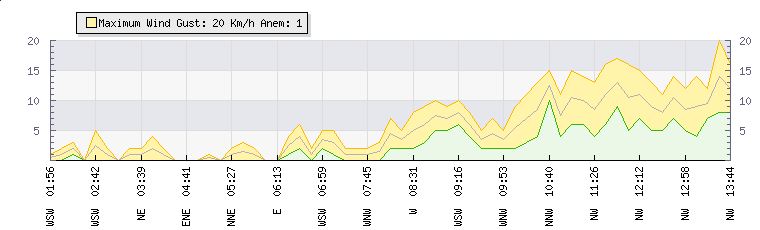 In the last few minutes the wind was North Westerly at an average speed of 11 kmh, reaching up to 15 kmh and a low of 7 kmh. The gust strength is8 kmh above the minimum speed |