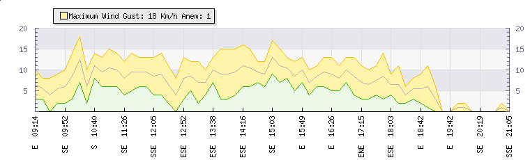 In the last few minutes the wind was East South East at an average speed of 9 kmh, reaching up to 14 kmh and a low of 4 kmh. The gust strength is10 kmh above the minimum speed |