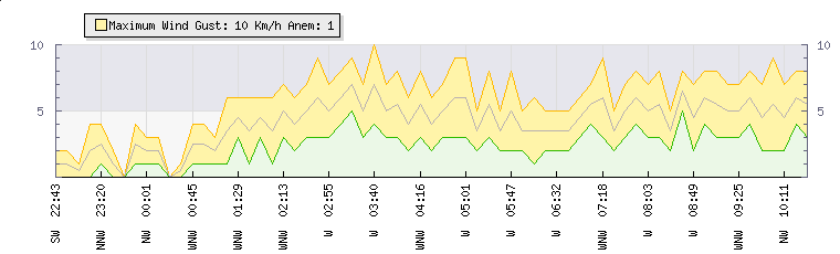 In the last few minutes the wind was Westerly at an average speed of 6 kmh, reaching up to 8 kmh and a low of 3 kmh. The gust strength is5 kmh above the minimum speed |