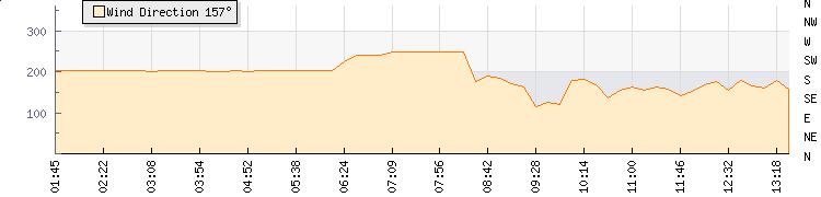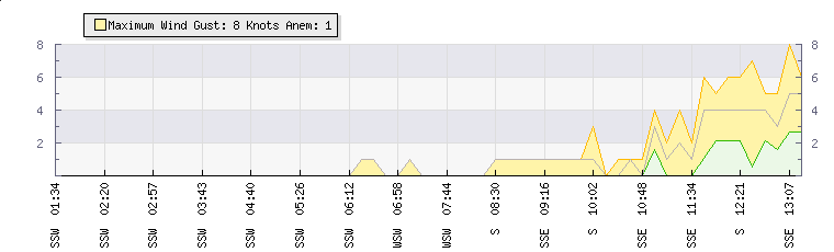 In the last few minutes the wind was South South East at an average speed of 1 knots, reaching up to 2 knots and a low of 0 knots. The gust strength is2 knots above the minimum speed |