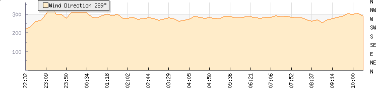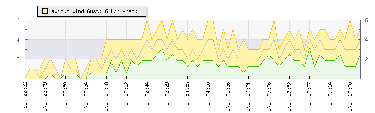 In the last few minutes the wind was Westerly at an average speed of 3 mph, reaching up to 5 mph and a low of 2 mph. The gust strength is3 mph above the minimum speed |