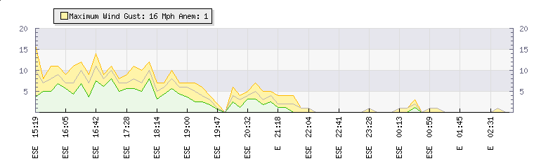 In the last few minutes the wind was East South East at an average speed of 0 mph, reaching up to 0 mph and a low of 0 mph. The gust strength is0 mph above the minimum speed |