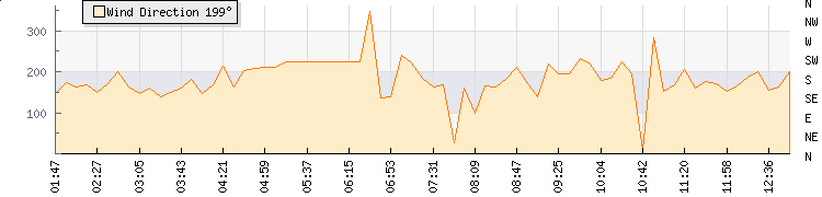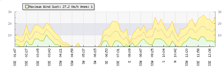 In the last few minutes the wind was South South West at an average speed of 7 kmh, reaching up to 14 kmh and a low of 0 kmh. The gust strength is14 kmh above the minimum speed |