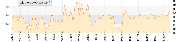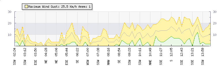 In the last few minutes the wind was South Easterly at an average speed of 11 kmh, reaching up to 19 kmh and a low of 3 kmh. The gust strength is16 kmh above the minimum speed |