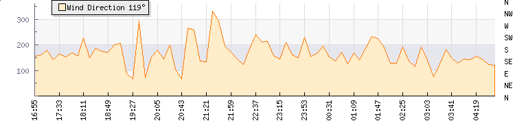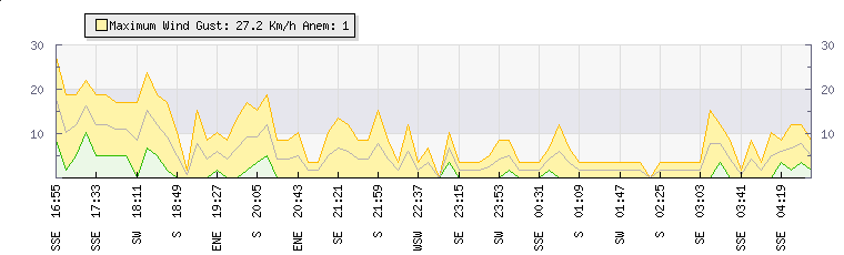 In the last few minutes the wind was South South East at an average speed of 6 kmh, reaching up to 9 kmh and a low of 3 kmh. The gust strength is6 kmh above the minimum speed |