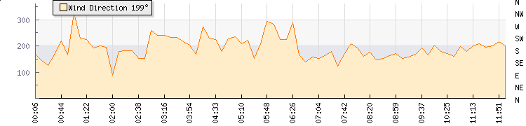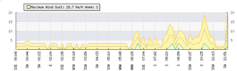 In the last few minutes the wind was South South West at an average speed of 3 kmh, reaching up to 7 kmh and a low of 0 kmh. The gust strength is7 kmh above the minimum speed |