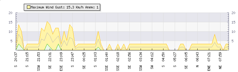 In the last few minutes the wind was South South West at an average speed of 2 kmh, reaching up to 3 kmh and a low of 0 kmh. The gust strength is3 kmh above the minimum speed |