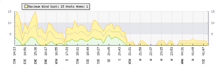 In the last few minutes the wind was Westerly at an average speed of 1 knots, reaching up to 2 knots and a low of 0 knots. The gust strength is2 knots above the minimum speed |