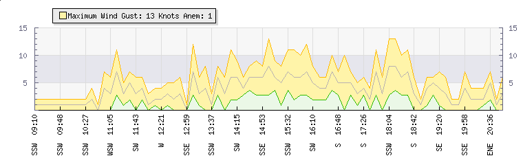 In the last few minutes the wind was North North East at an average speed of 3 knots, reaching up to 6 knots and a low of 0 knots. The gust strength is6 knots above the minimum speed |
