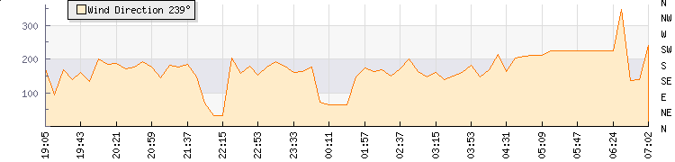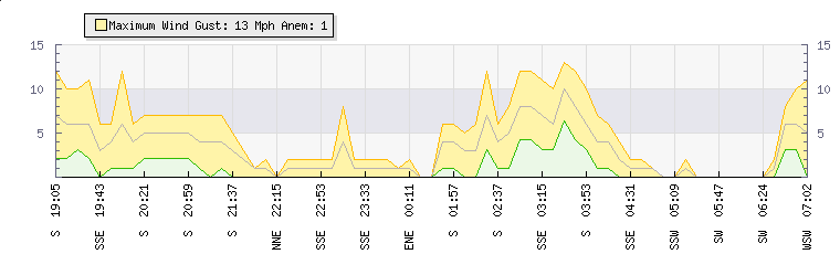In the last few minutes the wind was South Westerly at an average speed of 0 mph, reaching up to 0 mph and a low of 0 mph. The gust strength is0 mph above the minimum speed |