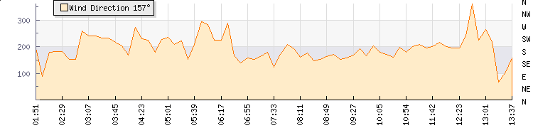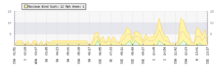 In the last few minutes the wind was South South West at an average speed of 6 mph, reaching up to 11 mph and a low of 2 mph. The gust strength is9 mph above the minimum speed |