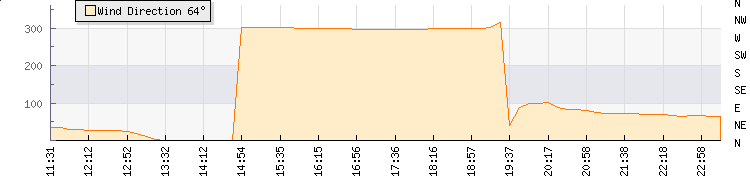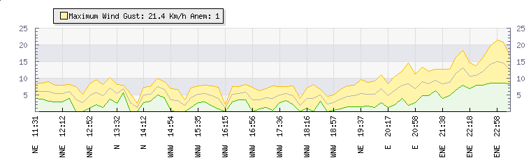 In the last few minutes the wind was Easterly at an average speed of 7 kmh, reaching up to 11 kmh and a low of 3 kmh. The gust strength is8 kmh above the minimum speed |