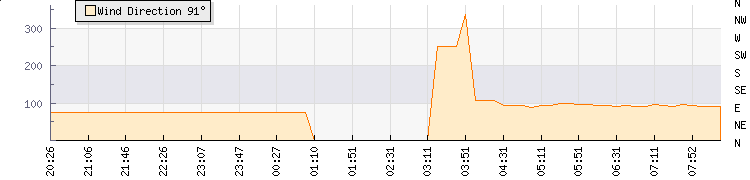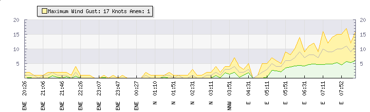 In the last few minutes the wind was East North East at an average speed of 0 knots, reaching up to 0 knots and a low of 0 knots. The gust strength is0 knots above the minimum speed |
