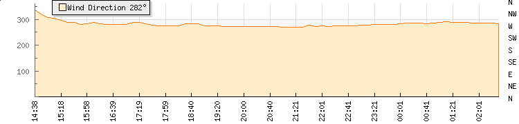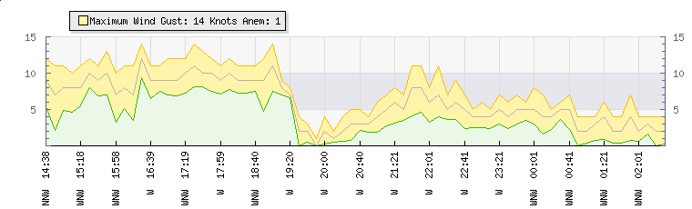 In the last few minutes the wind was West North West at an average speed of 5 knots, reaching up to 7 knots and a low of 2 knots. The gust strength is5 knots above the minimum speed |