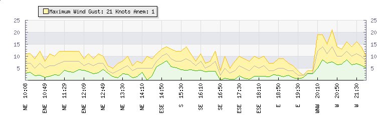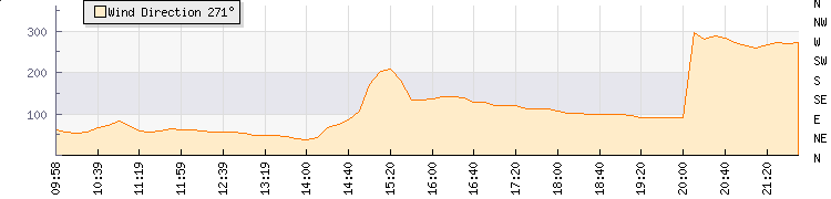 In the last few minutes the wind was Westerly at an average speed of 14 knots, reaching up to 19 knots and a low of 9 knots. The gust strength is10 knots above the minimum speed |