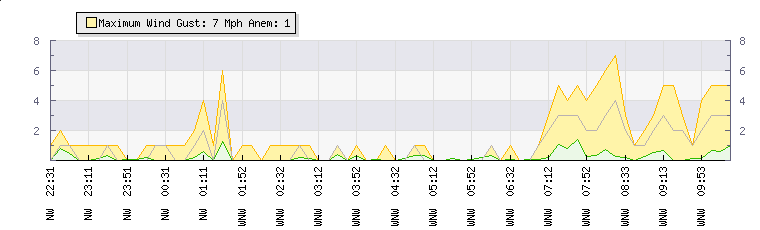 In the last few minutes the wind was West North West at an average speed of 2 mph, reaching up to 3 mph and a low of 1 mph. The gust strength is2 mph above the minimum speed |
