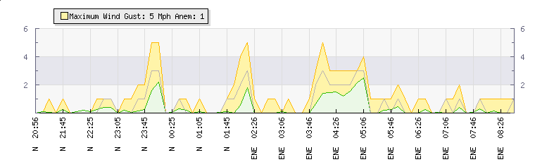 In the last few minutes the wind was East North East at an average speed of 0 mph, reaching up to 0 mph and a low of 0 mph. The gust strength is0 mph above the minimum speed |