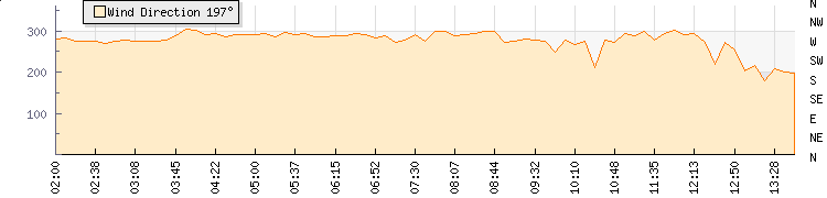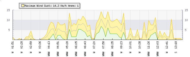 In the last few minutes the wind was West North West at an average speed of 5 kmh, reaching up to 8 kmh and a low of 3 kmh. The gust strength is5 kmh above the minimum speed |