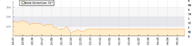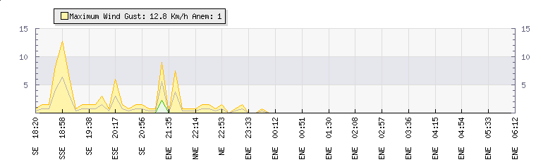 In the last few minutes the wind was East North East at an average speed of 0 kmh, reaching up to 0 kmh and a low of 0 kmh. The gust strength is0 kmh above the minimum speed |