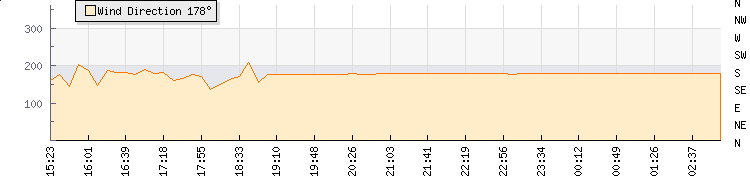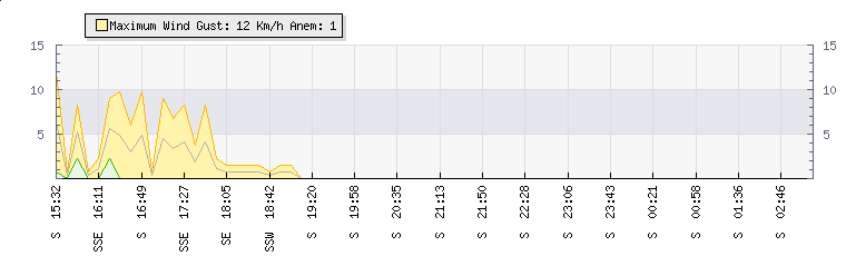 In the last few minutes the wind was Southerly at an average speed of 0 kmh, reaching up to 0 kmh and a low of 0 kmh. The gust strength is0 kmh above the minimum speed |