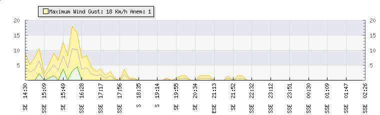 In the last few minutes the wind was South South East at an average speed of 0 kmh, reaching up to 0 kmh and a low of 0 kmh. The gust strength is0 kmh above the minimum speed |